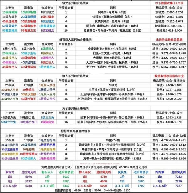 进入游戏打开游戏菜单,可以看到菜单栏中的【融合】按钮,点击即可打开融合界面,分别放入两只宠物,可以合成一直全新的宠物,并且概率发生变异。以下为宠物合成配方: