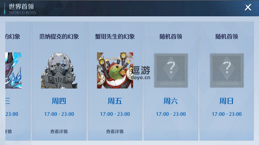 4、共有五个世界boss,周一至周五按照固定顺序出现,周六周末随机。boss出现后,小队队长或者单人和世界boss交互进入世界boss副本,最后奖励按照单人伤害排名结算。