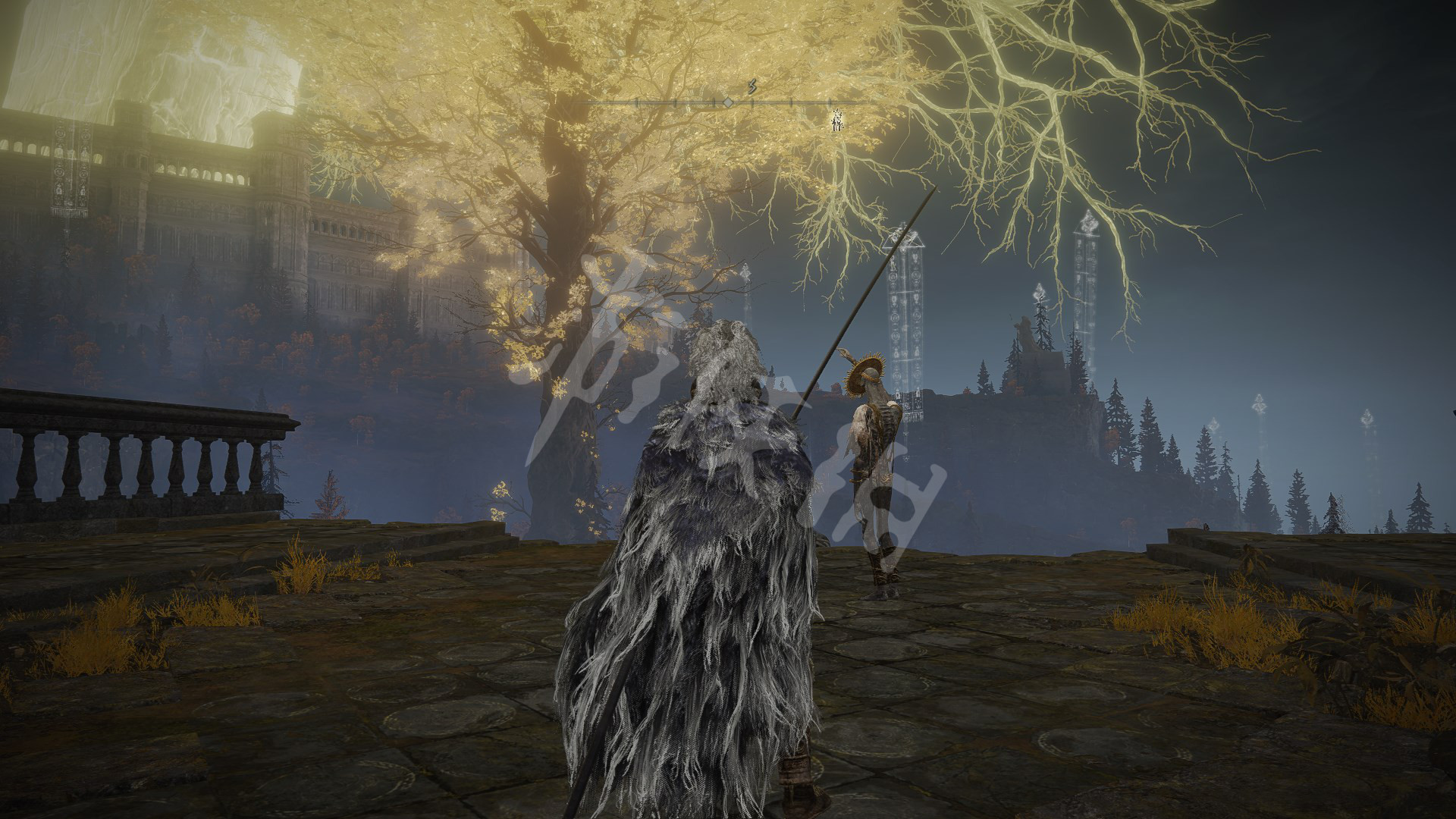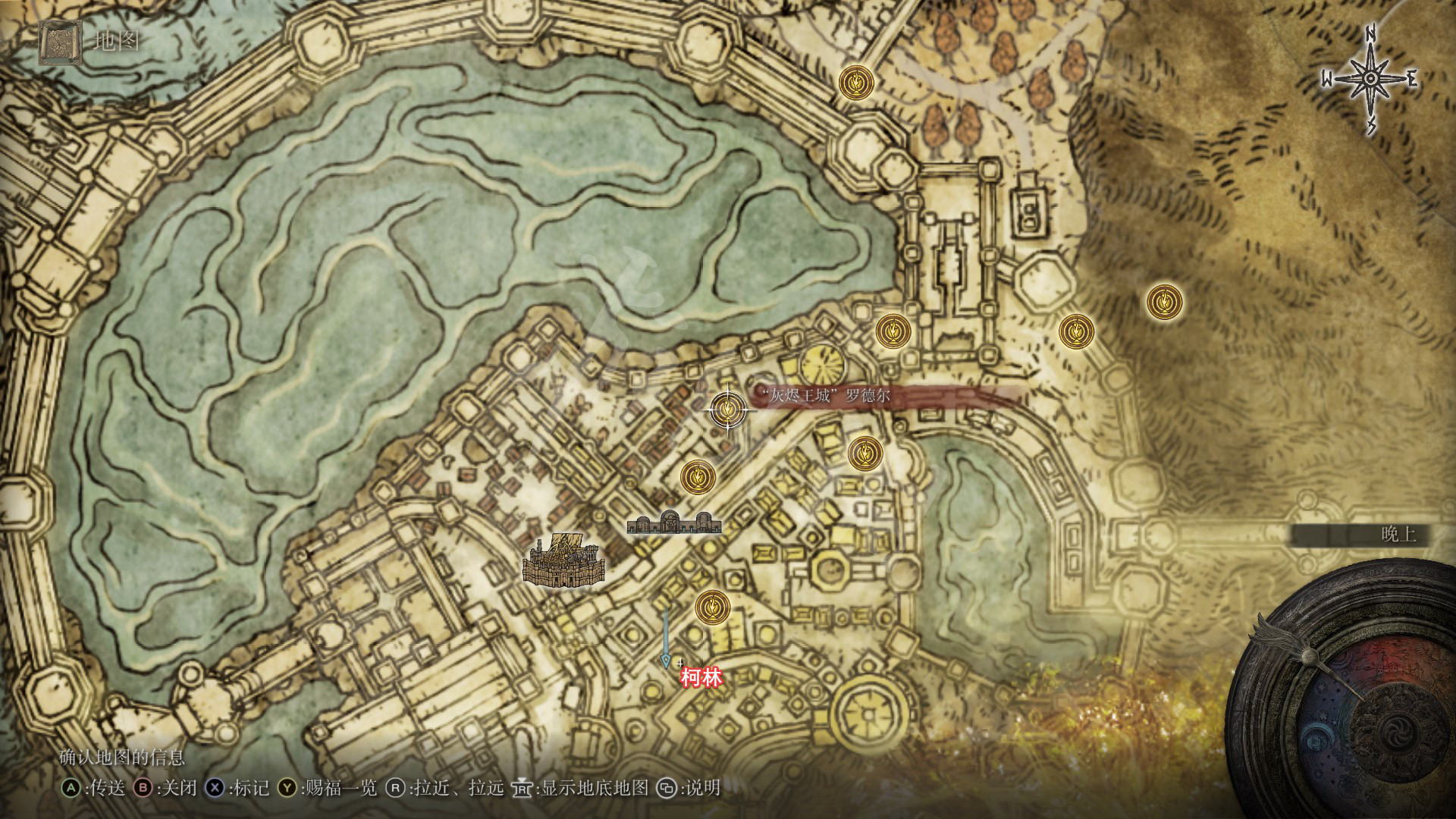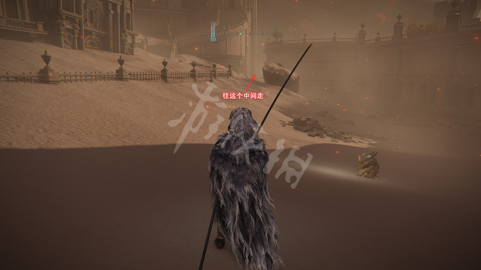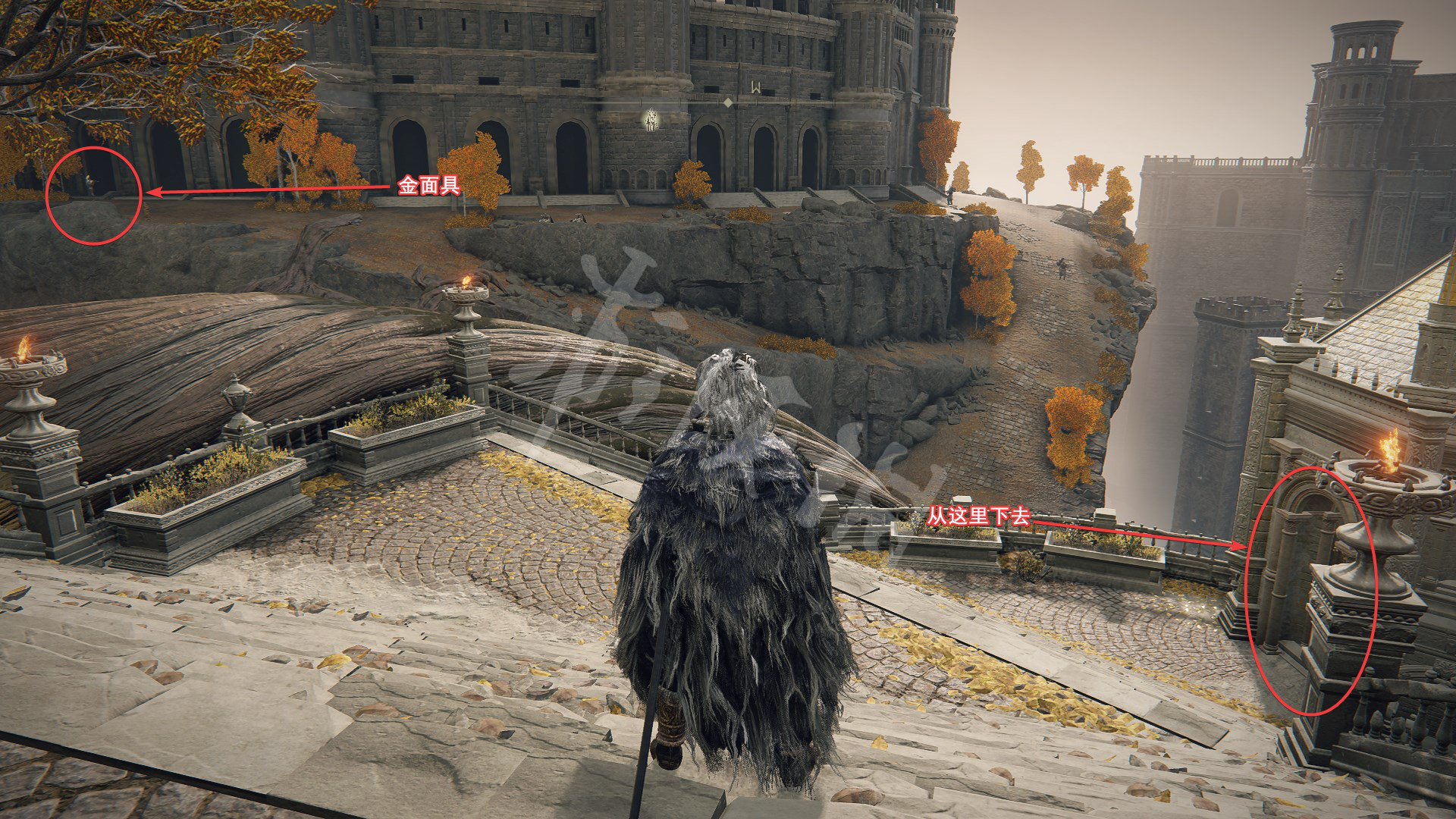 4.剧情推进到灰烬王城后,在如图处可以找到柯林,往箭头所指处前进,上山找到金面具拿到完美律法的修复卢恩。