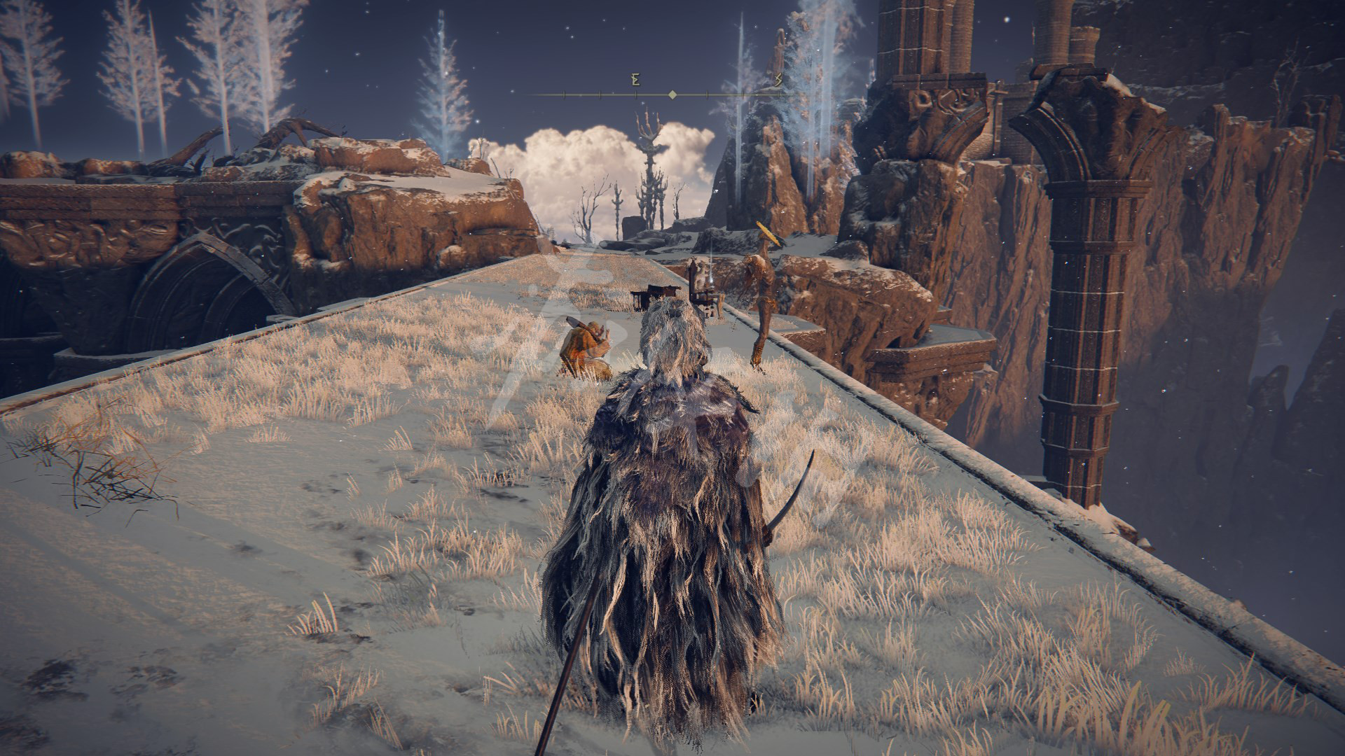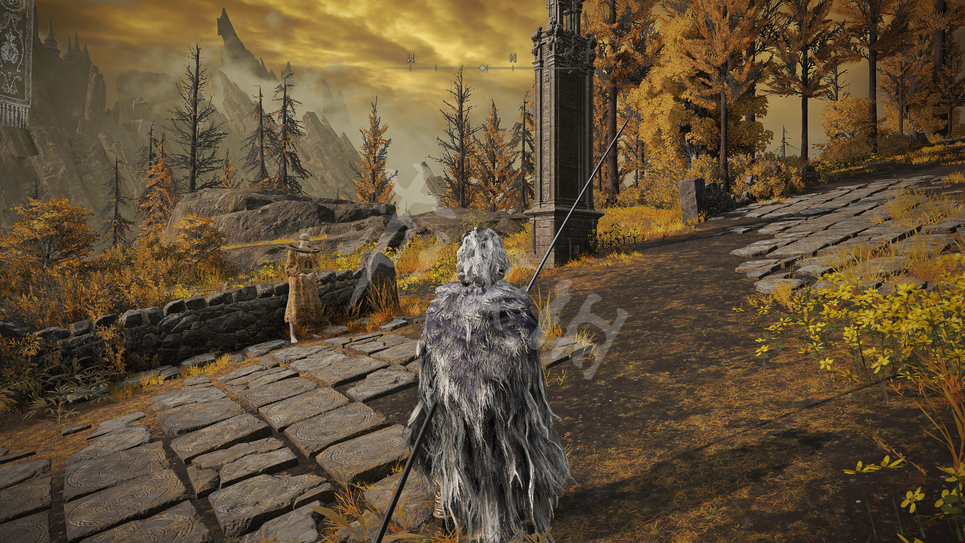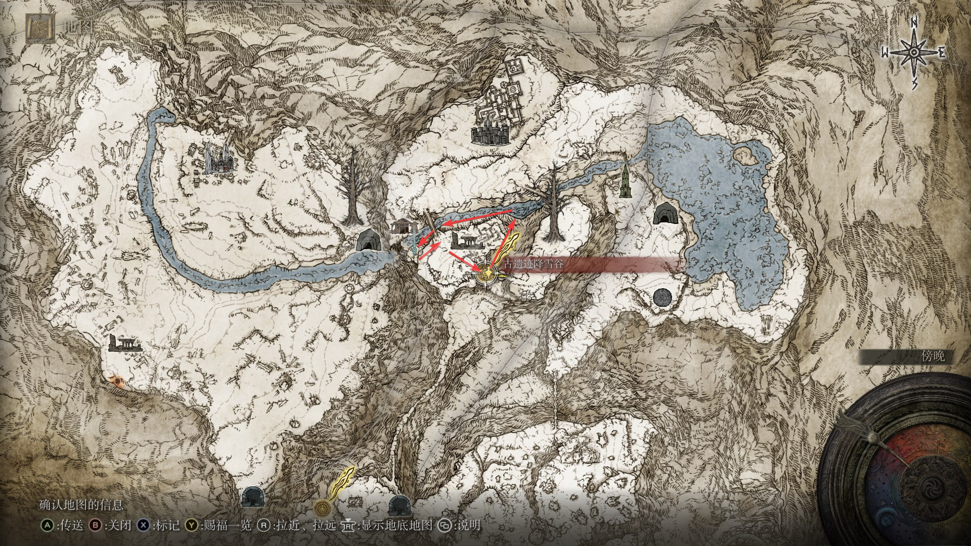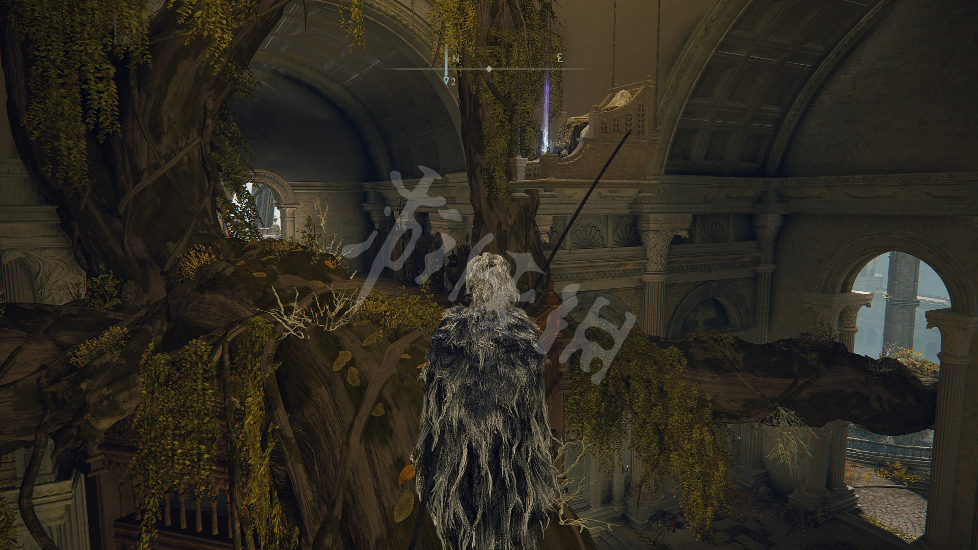 4.剧情推进到灰烬王城后,在如图处可以找到柯林,往箭头所指处前进,上山找到金面具拿到完美律法的修复卢恩。