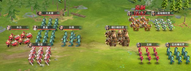 使用如图所示阵容,敌方2号位技能是横扫,我方可以最少的减少兵损,程普可以对对方直线敌军造成伤害轻松过关