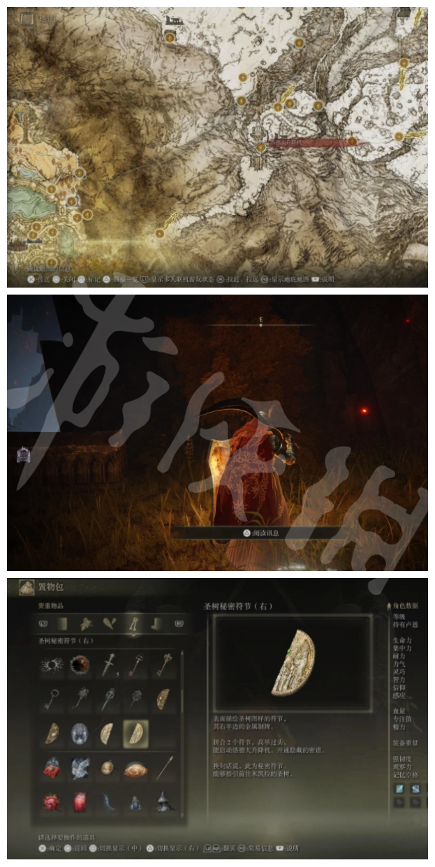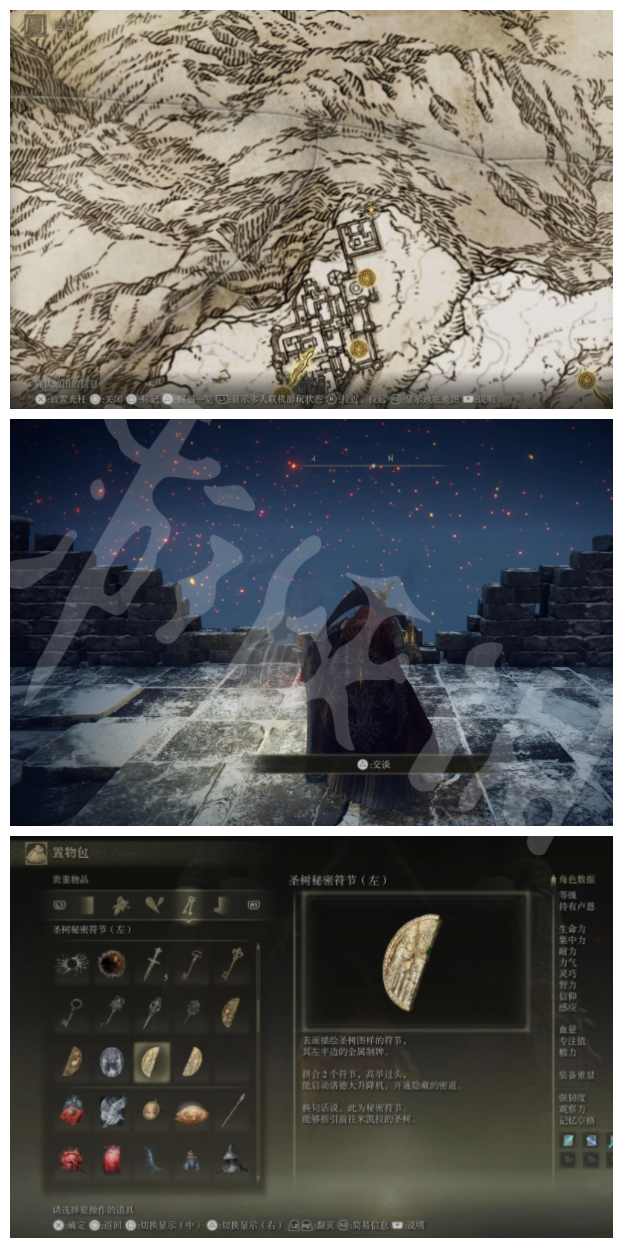 2、洛德符节的作用在大升降机处前往巨人山顶,想要前往化圣雪原就需要另一对符节圣树秘密符节,圣树秘密符节左边就在巨人山顶的索尔城中,击败 Boss 后继续坐升降梯往上走,在最高处尽头的尸体处捡到。