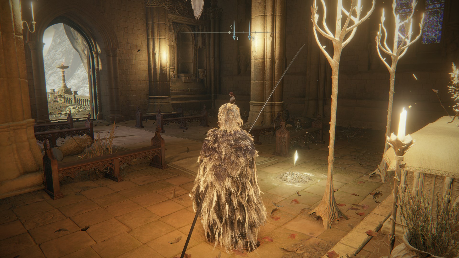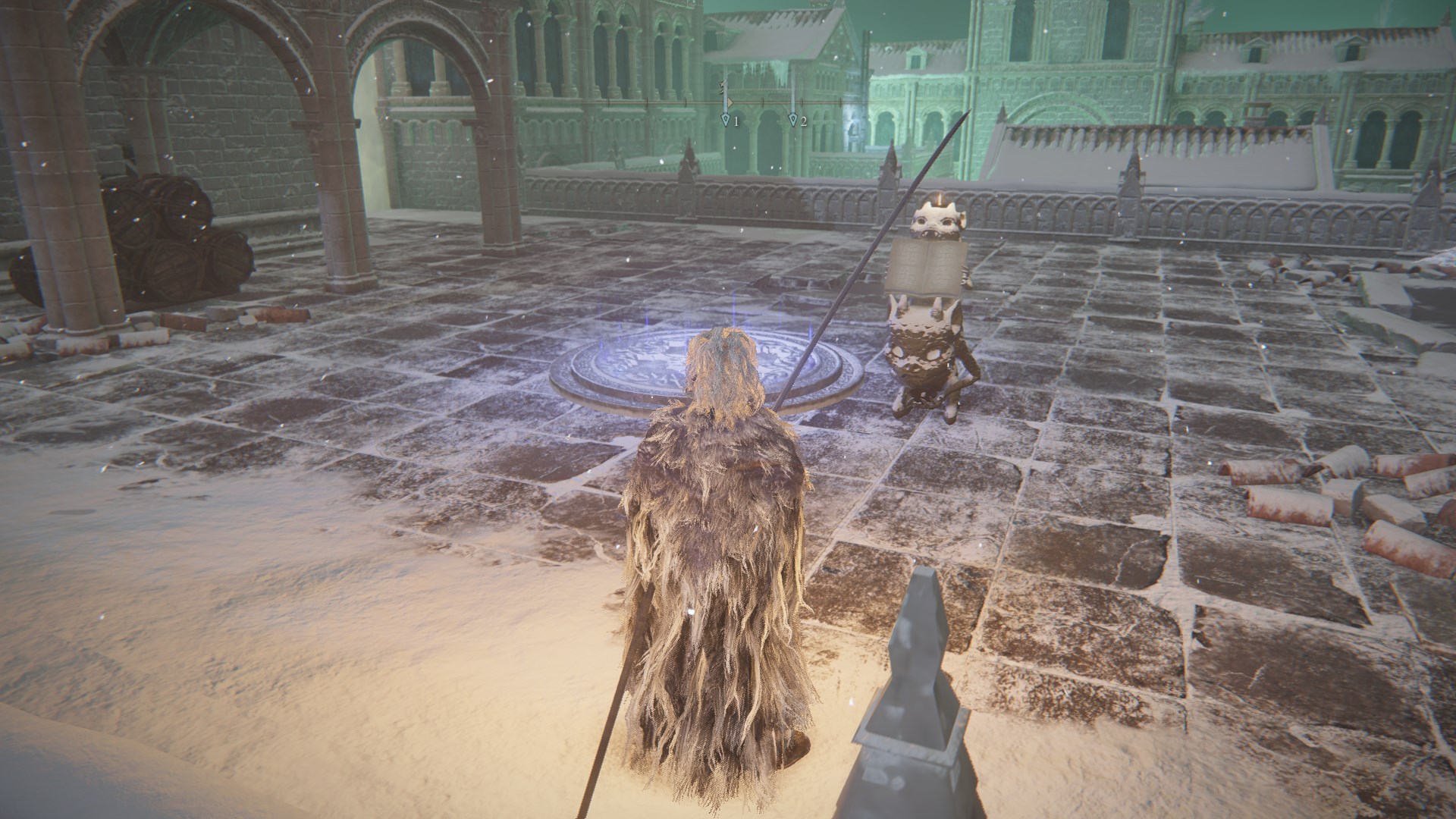 6.回到洛德大升降机,切换秘密符节,进入化圣雪原。找到西北角的“仪典镇”奥缇那,进入如图监牢点燃四座火焰,解开封印从传送门进入圣树。
