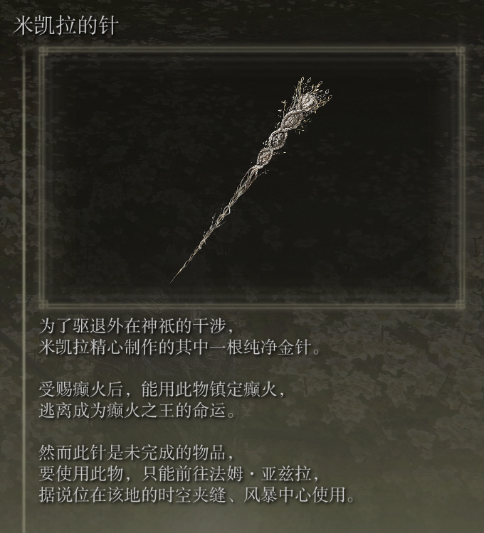 金针可以用来抑制癫火,即使接受癫火后也可以使用金针然后达成另外两种结局,金针只能在天空龙王处使用。