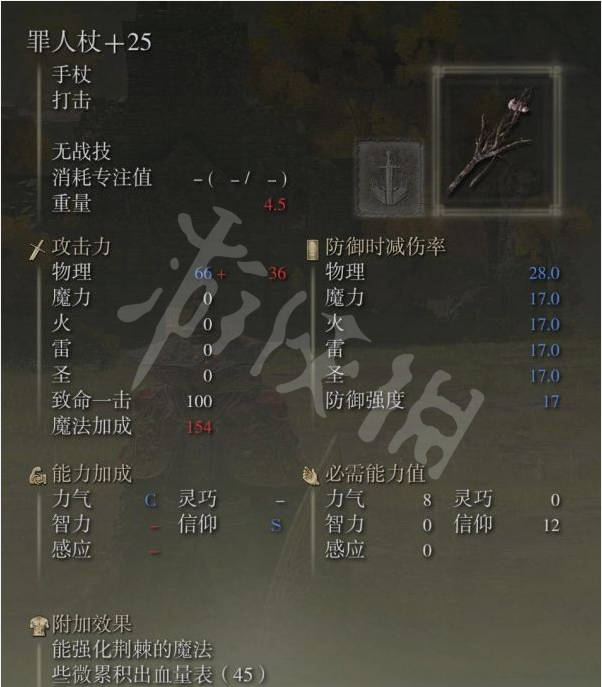 在法杖的选择上,我想大部分玩家第一时间想到的一定是这把罪人杖,荆棘魔法加成和出血量表加成,外加S级别的智力补正,一切看起来都是那么美好。