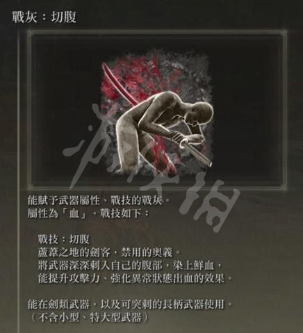 本身就带有出血效果的武器(太刀)会比没有出血效果的武器(剑)更好,配上切腹战灰的出血数值会更高。因此游戏初期就可以在【死亡降临的地下墓地】或是初始职业【武士】就可以拿到的打刀是一个很理想的武器,搭配前中期就可以取得的长牙就可以做一个很棒的搭配。
