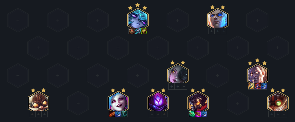 阵容组成:薇古丝(3)、斯维因(2)、阿狸(4)、卢锡安(3)、库奇(2)、金克丝(5)、玛尔扎哈(3)、维克托(5)、吉格斯(1)