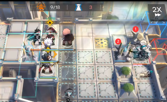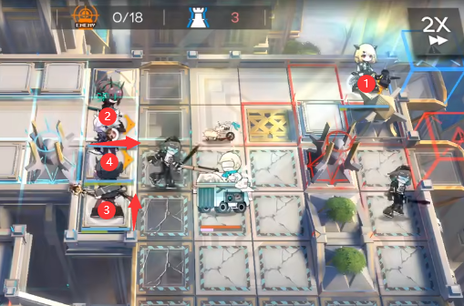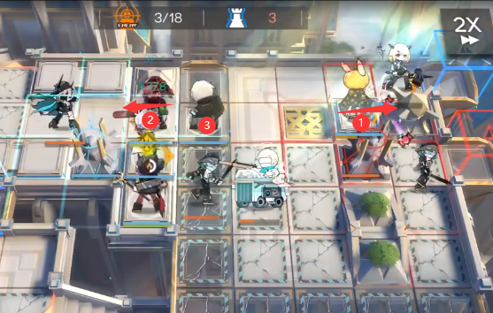 开局如下图所示顺序部署:先锋 → 先锋 → 单奶 → 单体术士(向右)