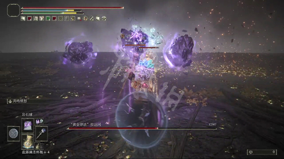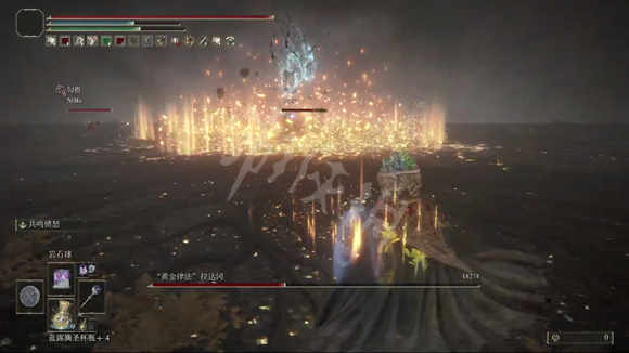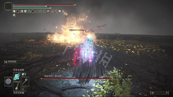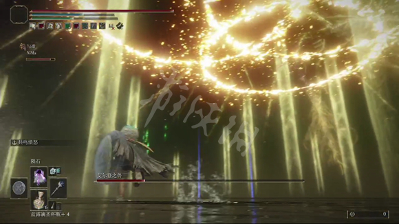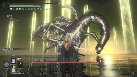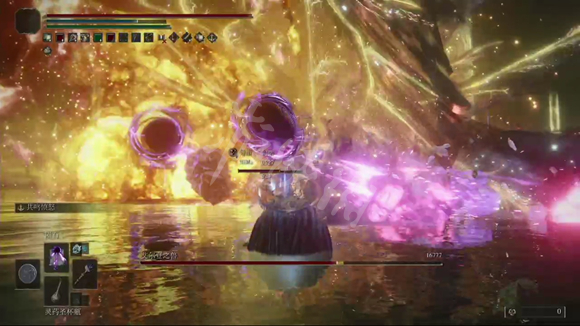 第二阶段:进入第二阶段后,BOSS会进化成艾尔登之兽,主要有物理攻击,它会在水里滑行,攻击速度中等,但是能躲避单一的法术攻击,所以不建议固定的法术,比如彗星。