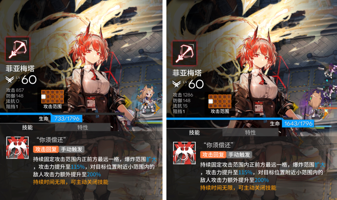 菲亚梅塔的一技能名为“你须直面”,效果非常简单直接:增加了一排三格的范围,提升到了身前五排。