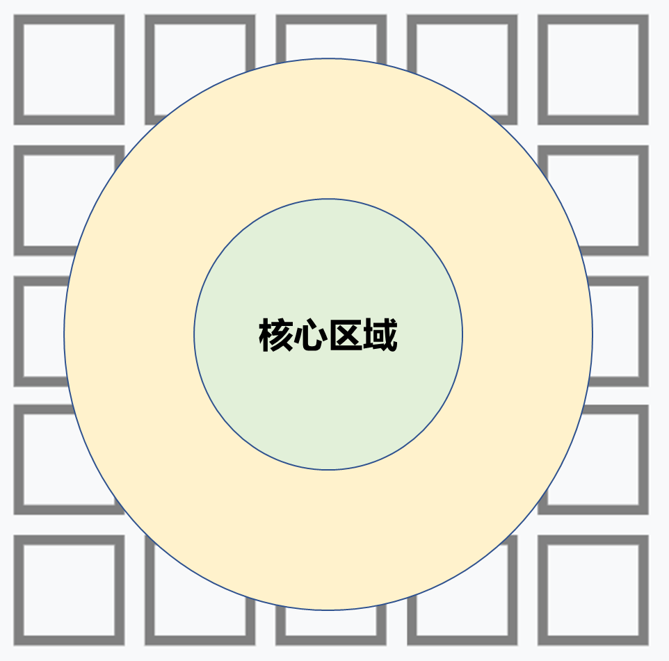 先聊一下爆炸的细节问题:爆炸半径是2格范围,影响着超过9格的敌人。其中爆炸中心是一个半径1.1格的圆形,位于其中过的敌人会受到额外伤害。这里用一张图来大致演示一下范围:
