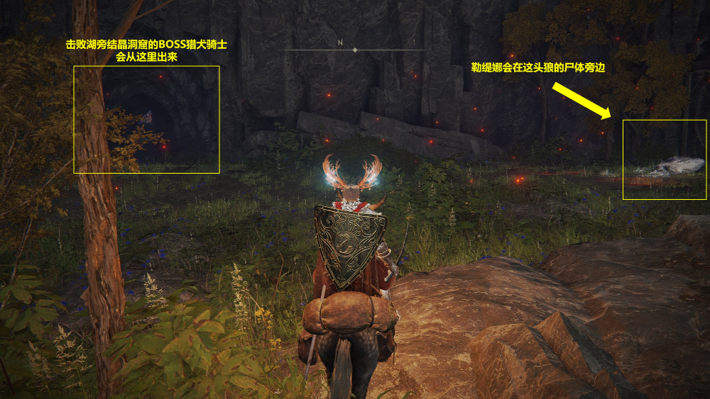 3. 然后探索湖旁结晶洞窟并击败BOSS后,继续向前,可以在一处小屋前发现勒缇娜。
