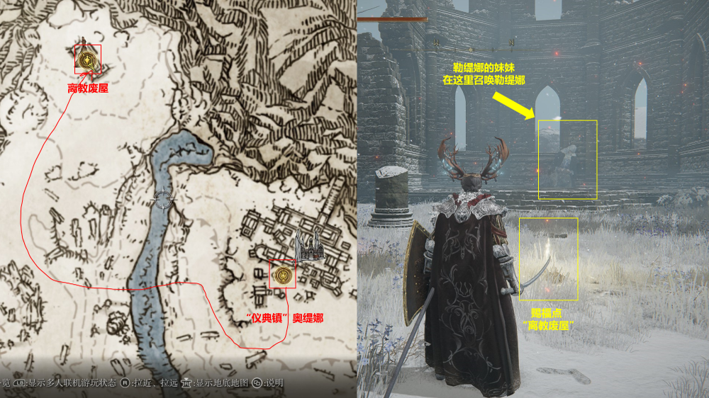 6. 来到离教废屋后,在废屋最里面的巨人尸体旁,装备勒缇娜的骨灰并召唤勒缇娜,与其对话后任务结束,就可以拿到古龙岩失色锻造石了。