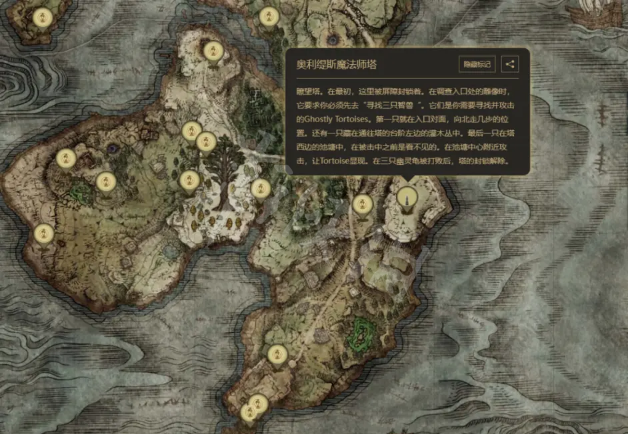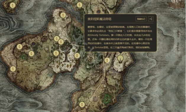 记忆石②:地区为啜泣半岛,附近赐福为“地坑旁”和“摩恩城(城墙前方)”。通过跑图来到啜泣半岛东边的“奥利缇斯魔法师塔”,调查门口的书后找到三只“幽灵龟”并全部攻击后开启法师塔封印后于楼上宝箱取得。三只幽灵龟分别位于入口对面、台阶左边的灌木丛中、塔西边的池塘中心。
