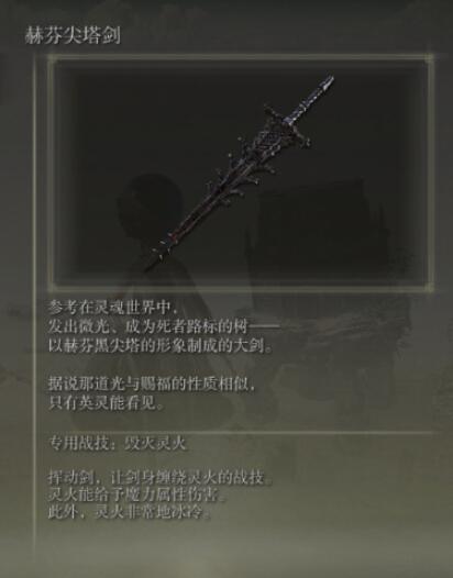 同时还会获得赫芬尖塔剑,在灵魂世界中,发出微光、成为死者路标的树,以赫芬黑尖塔的形象为原型制成的大剑,据说那道光与赐福的性质类似,只有英灵能看见。
