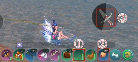先选择钓具,然后选择钓饵,最后按攻击键抛竿