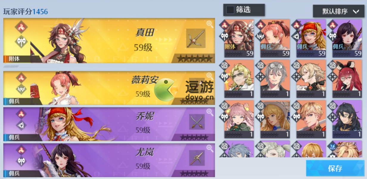 2、阵容二:真田、薇莉安、乔妮、尤岚。全火元素,最快速叠加火元素debuff造成高额伤害。