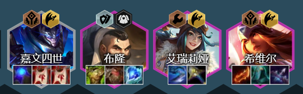 英雄组成:波比、机器、蕾欧娜、德莱文、布隆、烬、泽丽、金克斯、杰斯/诺手/加里奥