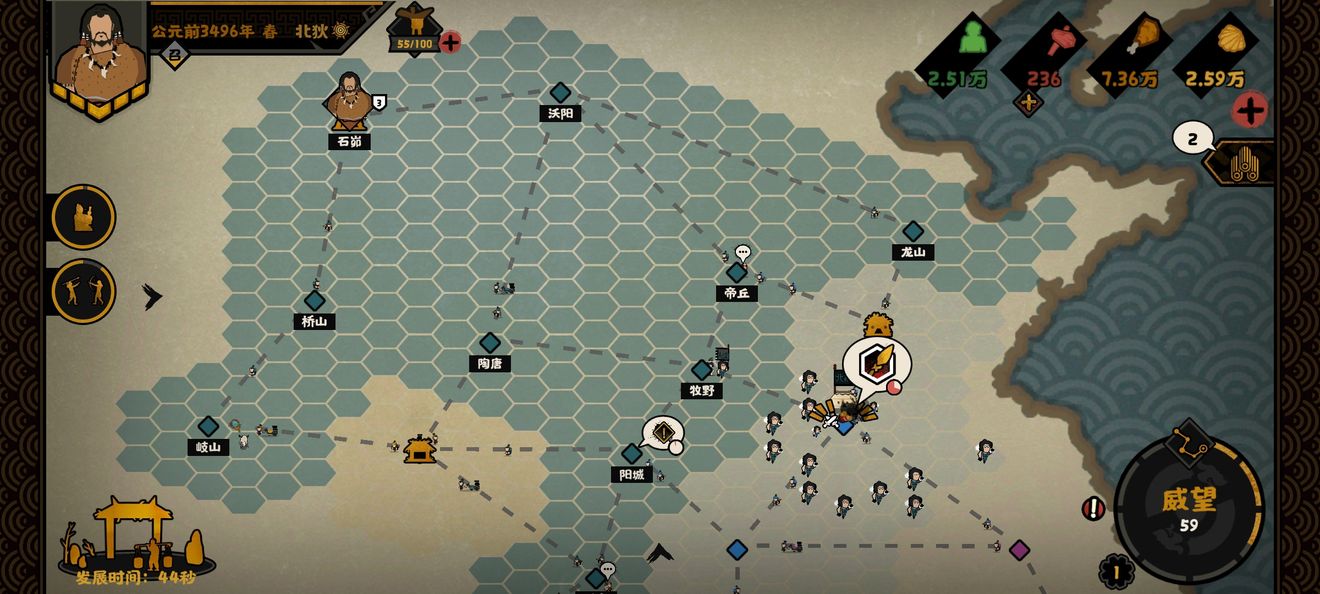 名臣出现的时间,7分一年,比如你刷羲和选北狄往下打一个就是羲和刷新的地点,然后挂机22分30秒,上线就能看到羲和刚刷到你的领土。