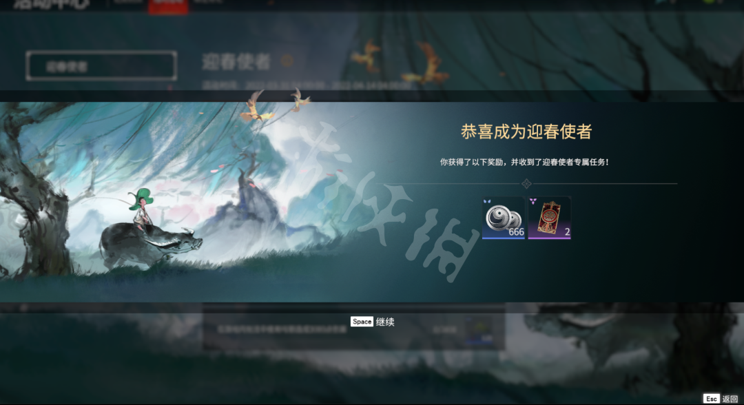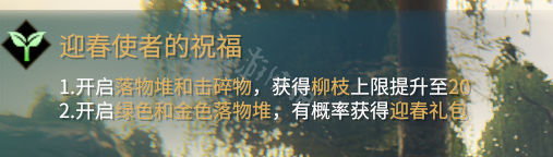 此外,完成每周任务,或在战局中开启落物堆和击碎物可以获得柳枝,迎春使者消耗迎春贺卡为玩家送上祝福(迎春使者只能向在线玩家赠送迎春贺卡),玩家还将获得青团一个,通过收集柳枝与青团,兑换珍稀奖励!