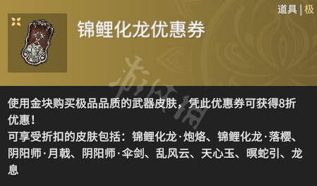 ——还有购买【锦鲤化龙·炮烙】、【锦鲤化龙·落樱】可享受折上折优惠的锦鲤化龙优惠券!