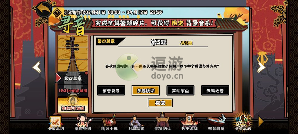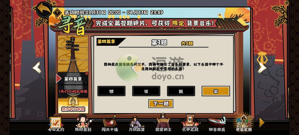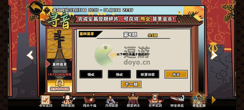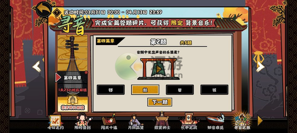 街机cn 来源:厂商 发表于:2022-04-05无悔华夏寻音之旅第四篇答案是什么?无悔华夏巡音之旅第四章已经更新了,主要是对几种远古乐器的提问,下面就为大家分享以下寻音答案——第四篇,可以参考一下哦。