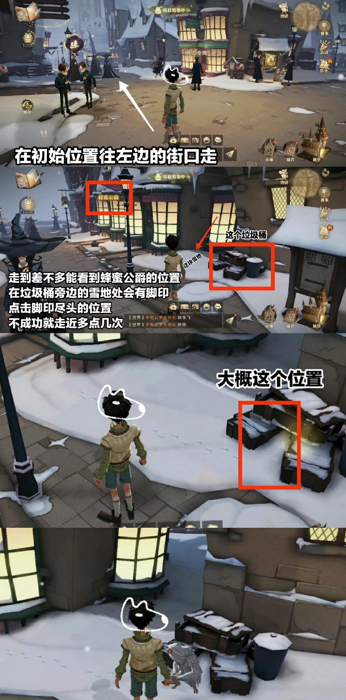 地点:进入霍格莫德后往左边的街道走,走到能看到蜂蜜公爵店位置,旁边会有一个垃圾桶,在垃圾桶处等一会可以看到隐形兽的脚印,点脚印尽头过去一点身子的位置,不出来就多点几下。