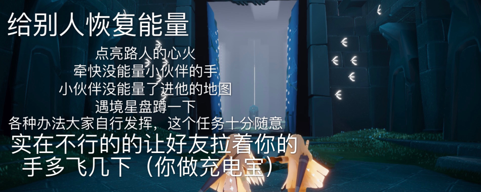 「向其它玩家传递能量」给快没能量的玩家回复能量(大叫,牵手,点蜡烛),和好友手拉手进一个地图,去云野点亮一个无翼,实在不行的的让好友拉着你的手飞几下(你做充电宝)就行了。