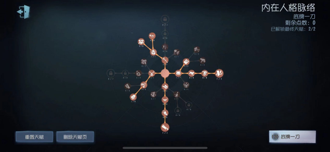 此套天赋比较通用,前期可以携带辅助特质【闪现】,配合追猎进行快速击倒,在中后期根据场上局势来考虑使用【底牌】切换成【失常】,配合降低密码机破译进度;开门战利用【报幕】的获取信息能力灵活使用【底牌】切换【传送】,配合“无效”的封门效果,在开门战掌握主动权。