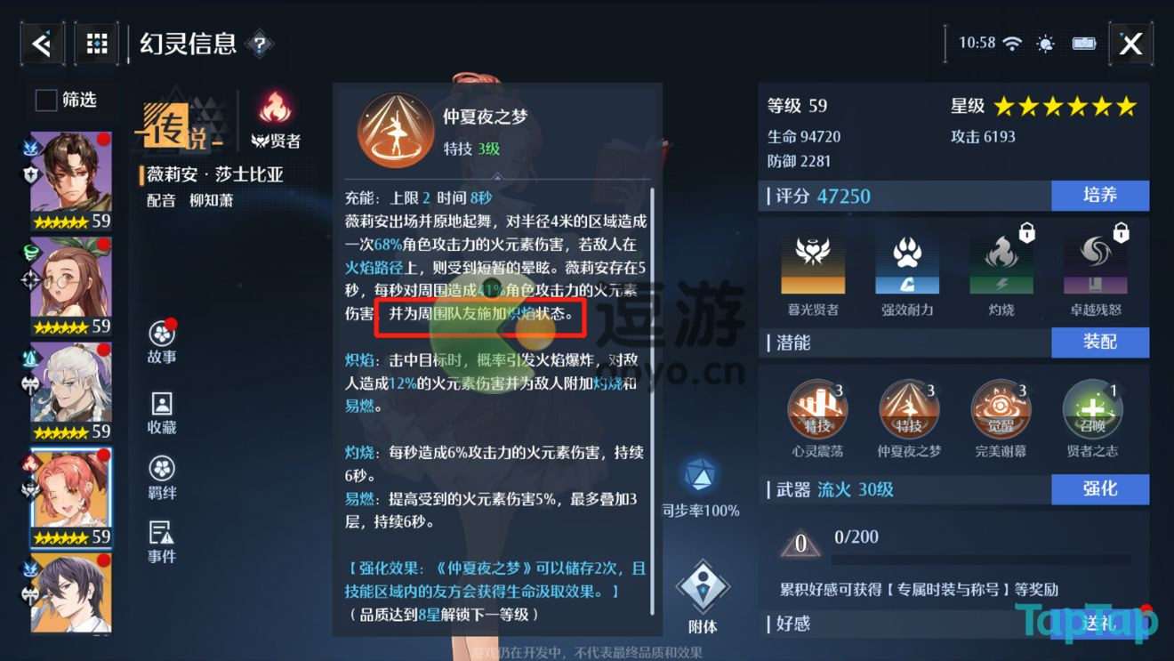 3.薇莉安本身是一名烈焰元素的治疗型幻灵,但是她最黑科技的地方并不是在于治疗也不是大招,主要是她的小技能中,有能给队友附加【炽焰】buff的效果。所谓的【炽焰】buff,就是能让非烈焰元素的幻灵,也能通过攻击产生烈焰元素的debuff。也就是说,有薇莉安的存在,就相当于带了三个烈焰元素的幻灵。