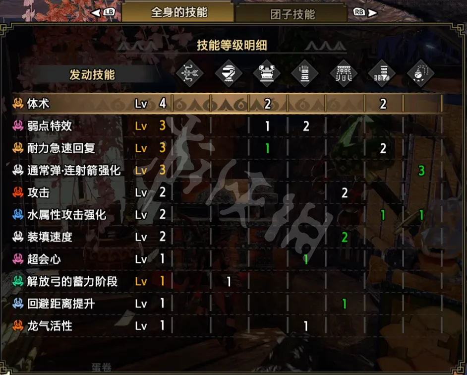 体术4,弱点特效3,连射箭3,水属性2,耐力急回2,装填2,解放弓蓄力1。