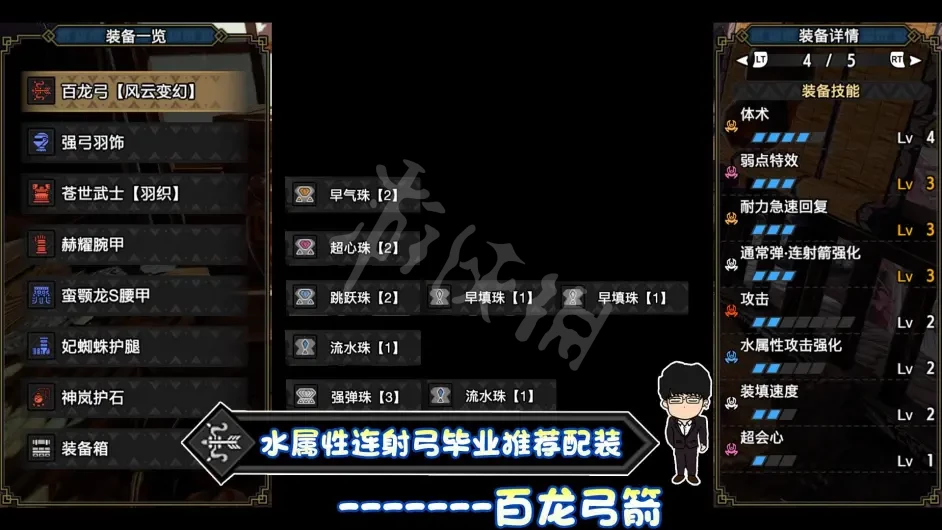 百龙技能方面主选攻击力强化4,水属性3,变更射击类型【连射】,追加强击瓶,追加减气瓶,变更曲射【会心型】