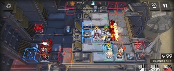 3、然后高台部署红蒂、夜莺/白面鸮,最后部署小火龙冲上烧,期间桃金娘技能好了就马上开技能爆费,把cost弄充足,cost足够了左下角马上部署泥岩来吸引大炮,之后就是纯粹的挂机模式了,不用管了。
