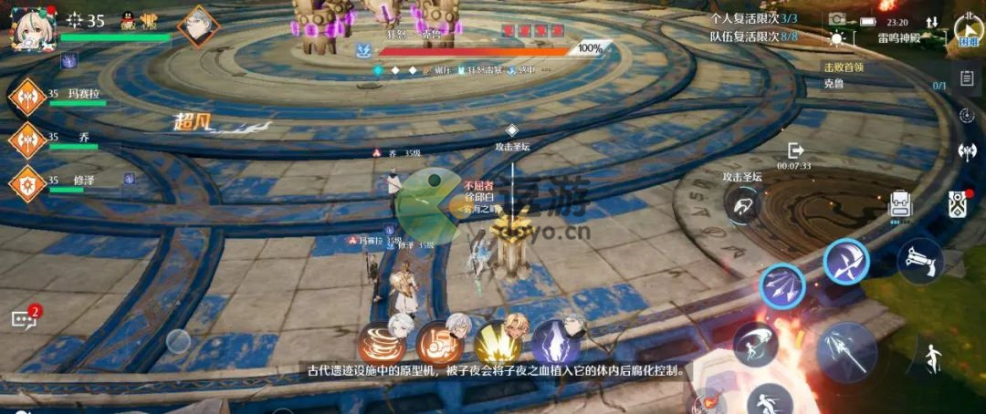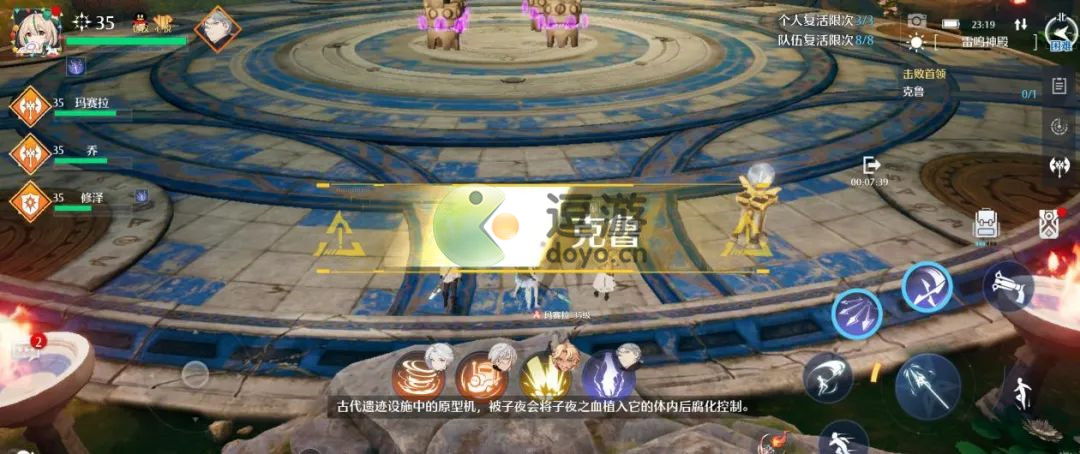3.最后,冒险家们顺着水滑梯来到了首领BOSS狂怒·克鲁的所在地,在冒险家们右手边的柱形物体就是挑战目标里说的圣坛,冒险家们需要靠近它并点击出现的按键来激活圣坛。