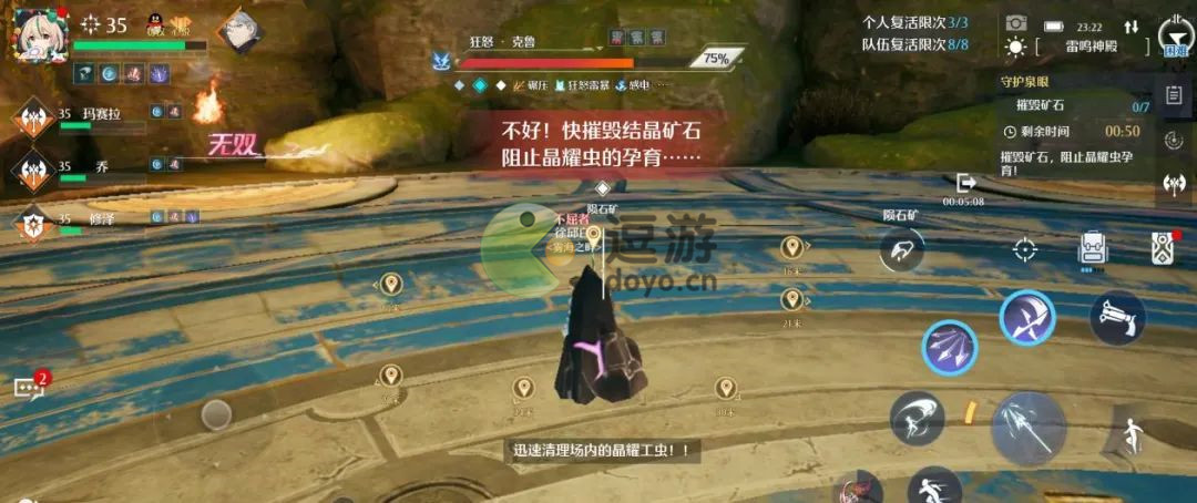 6.在第二阶段,它会跳到远处的高山上,在地上留下七个陨石矿,冒险家需要在57秒之内摧毁它们,如果未及时摧毁,陨石矿就会孵化出光耀种族的晶耀坦克虫,摧毁一个陨石矿大约需要3~4秒,时间还是比较充足的。