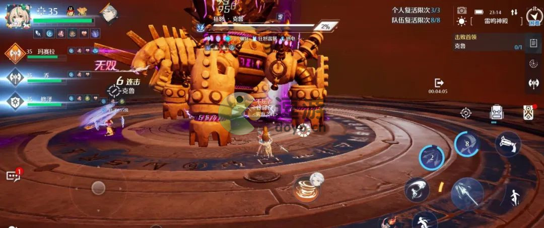 4.首领BOSS狂怒·克鲁有三个阶段,在第一阶段首领BOSS狂怒·克鲁技能释放频率较低,在进入激怒阶段后,迅速释放四个幻灵觉醒技能形成连携,跳过激怒阶段进入破防阶段,在此时对它的足部雷光发射器进行攻击,至少能破坏一个足部雷光发射器。