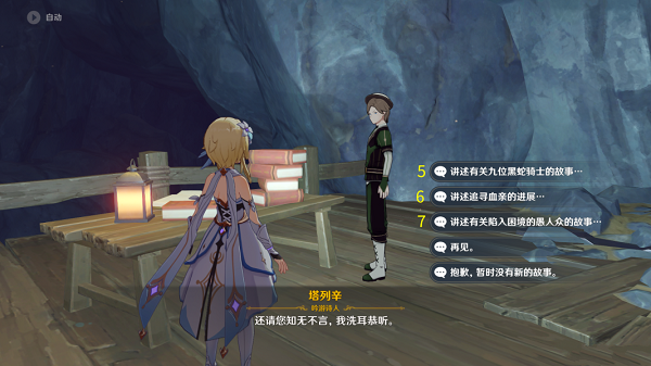 下面是7个故事对应的任务和成就,若旅行者缺少选项,只需完成对应任务和成就后,再来找塔列辛对话即可。