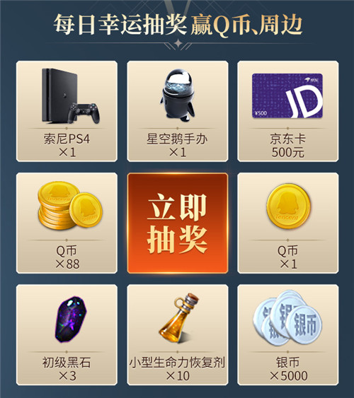 玩家通过腾讯先锋APP登录《黑色沙漠》手游,可以获得一次抽奖机会,索尼PS4、京东卡(500元)、星空鹅手办、88Q币等豪华大奖均有机会获得。活动期间,每人每天最多可获得两次抽奖机会,分享活动页面也能获抽奖机会哦!本次抽奖的实物奖品超级丰富,不可错过!