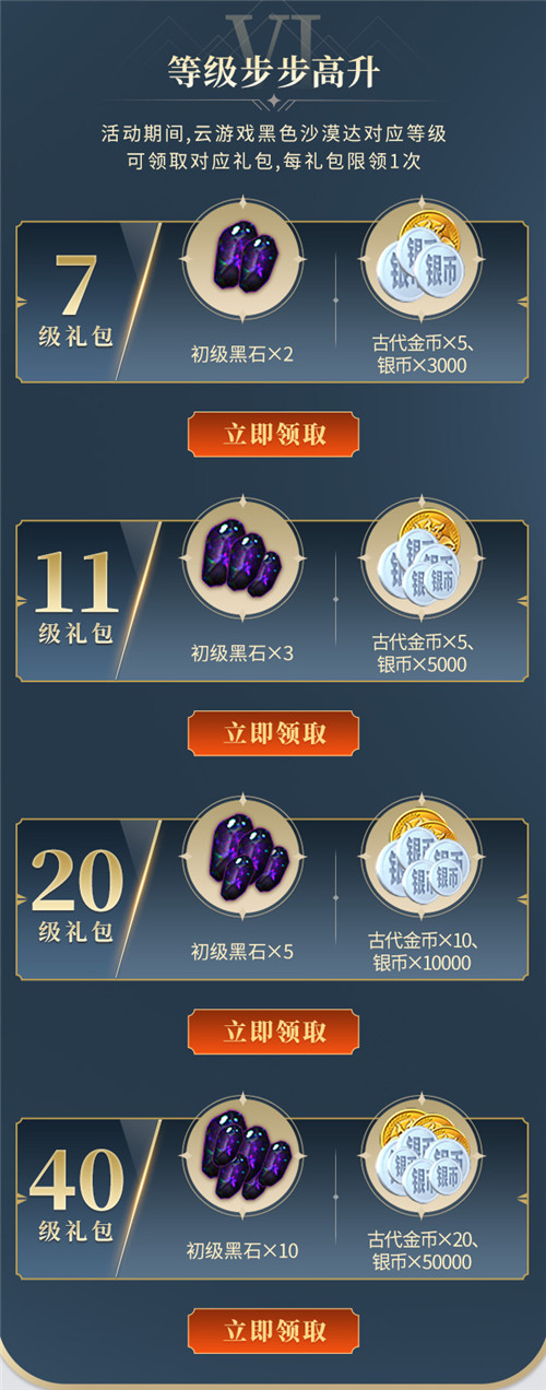 与此同时,腾讯先锋为热爱《黑色沙漠》手游的玩家还准备了冲级好礼。云游戏达到7/11/20/40级时,均可获得一份内含初级黑石、古代金币、银币在内的礼包。等级越高,礼包奖励越丰厚,让玩家不用为资源的获取而操心!