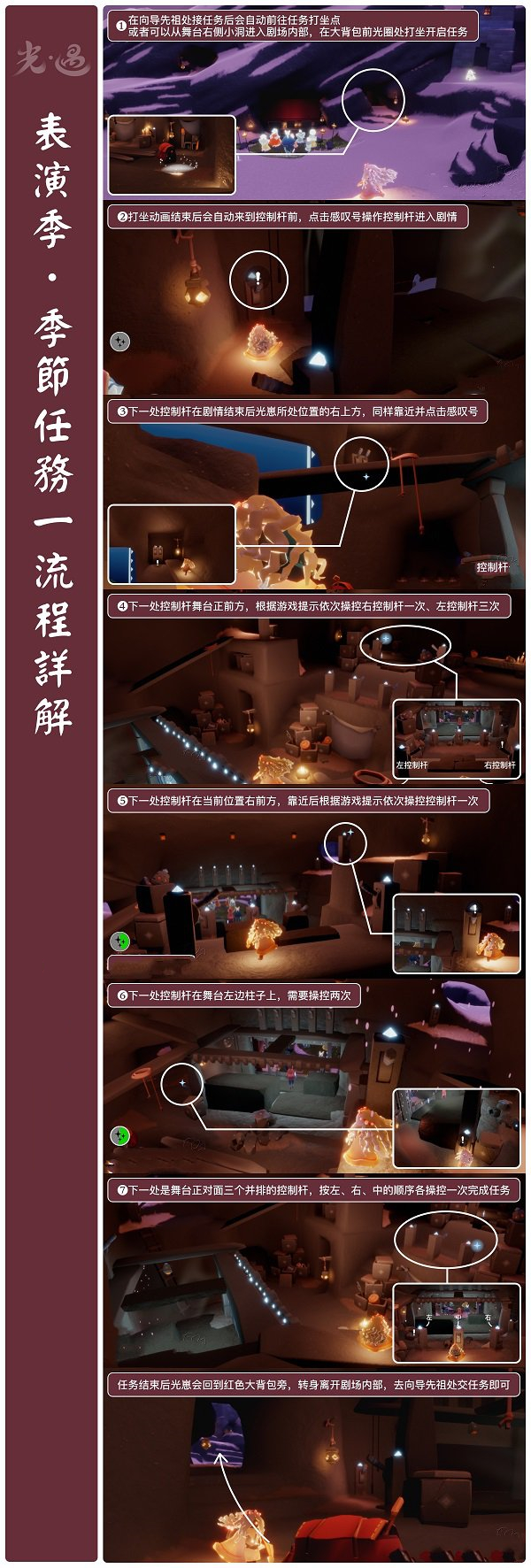 街机cn 来源:厂商 发表于:2022-04-28《光遇》表演季开放之后,今天也是开放了季节任务一,对于这个任务可能有玩家还不知道要怎么做,具体的任务流程是什么,如果有对这个任务不清楚的玩家也不用担心,下面小编就给大家整理了具体的任务攻略,一起来看看吧!