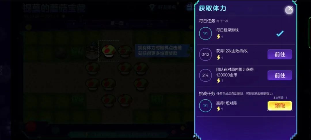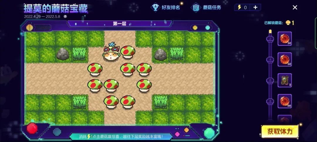 和提莫一起寻找蘑菇宝藏吧!4月29日10:00—5月8日23:59,完成任务即可获得体力,消耗体力点击蘑菇,可解锁随机任务、奖励等。解锁蘑菇达到一定数量,即可领取对应蘑菇里程碑奖励。