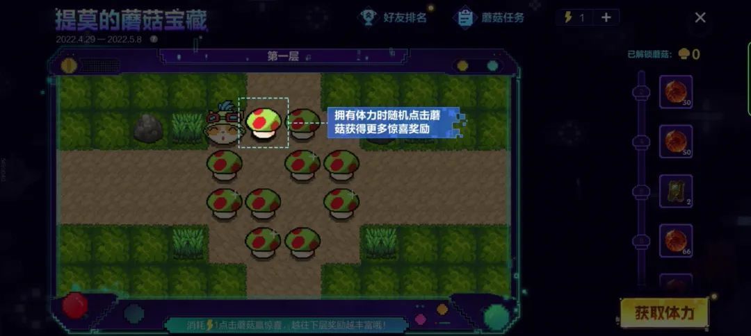 (5)蘑菇地图总共分为5层,每一层有1个随机蘑菇为通往下一层的入口,点击蘑菇找到入口后,再次点击入口,即可通往下一层,越往下层奖励越丰富;