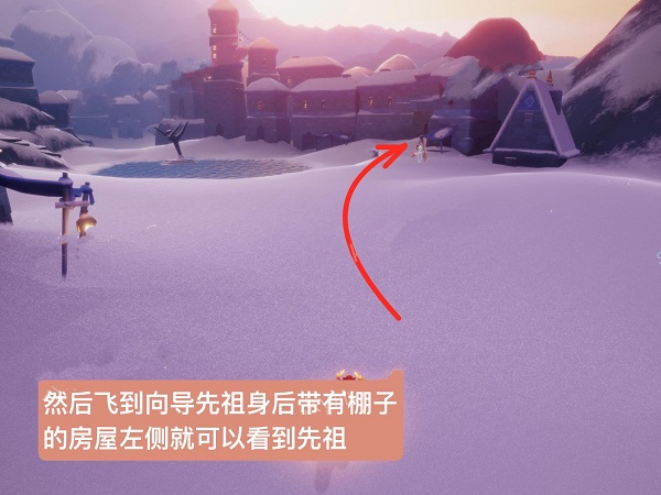 3、然后飞到向导先祖身后带有棚子的房屋左侧就可以看到先祖了。