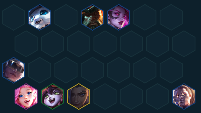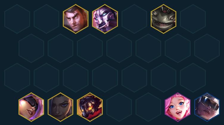 后期决赛圈上九,慢慢拆过渡和赏金体系换掉阵容,挂五费卡提升阵容上限,具体的阵容需要视实际搜牌情况决定,在这里给大家一个9人口阵容的参考图,金克丝和加里奥一起跳进敌方阵容,泽丽吃电刀鬼书输出也很高,杰斯塔姆优质前排,3名流保证c位输出。