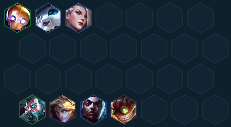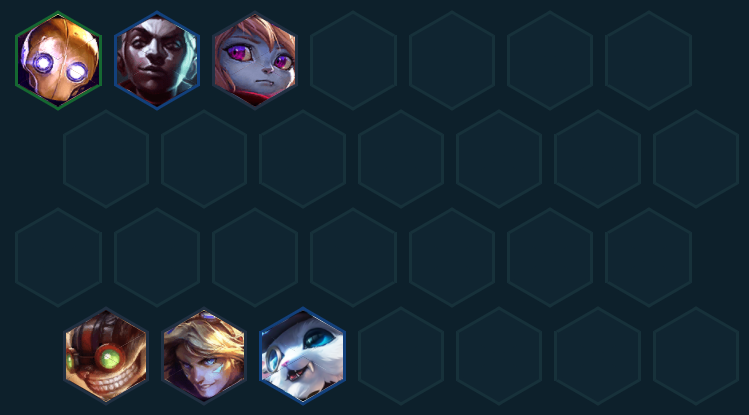中期运营3-5/4-1上七,补充蕾欧娜和时光老头,根据嫖到的卡保证场上最大战力,有歌姬可以换掉时光,有刀妹换下炸弹人,有布隆换掉蕾欧娜,希维尔来了直接卖EZ给装备上场。一般不搜卡硬抗存钱4-5上八找阵容主体,天崩局直接大搜出希维尔保分。