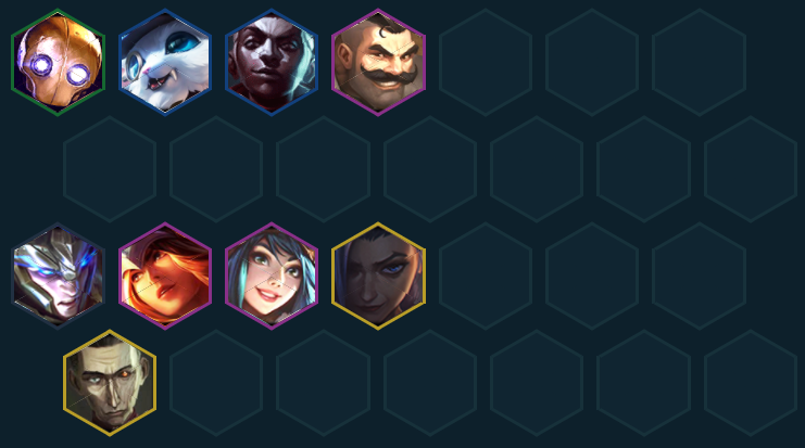 后期变阵4-5拉八,大搜找希维尔、布隆和刀妹三张四费卡,先保证4极客4强袭2保镖的基础阵容,再根据场上情况决定是否继续搜整体二星质量还是直接上九找金克丝,一般来说二星希维尔足够锁血上九。