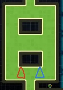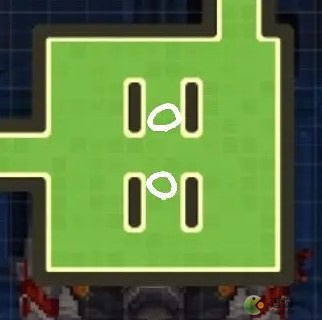 (注释:黑色圆圈是炎爆怪/激光怪;红色三角是攻击减免塔;蓝色三角是防御减免塔;橙色三角是激光塔;白色圆圈是重伤塔)