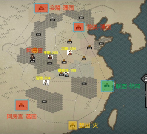 我将这个打法分为3个阶段,第一阶段简称打地盘,不要多打也不要漏打。一共5个点,灭魏国,灭张楚。占住下面5个圈。打完和曦应该是开了2次技能,平平淡淡。