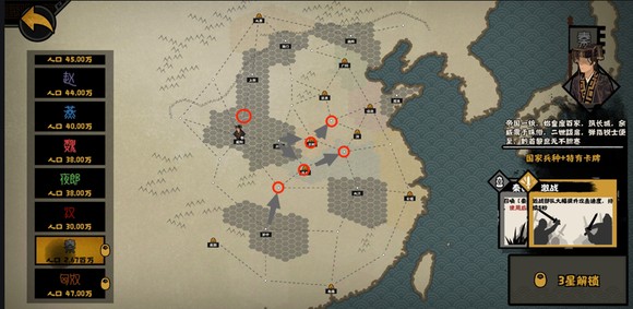 TIPS:4步1车团团站,魏国和张楚都是枪兵为主,尽量进林子,钻河道。攻城的时候抱团走,以多打少,全面接站开技能,锐士保底。期间可以用调兵来分配各城兵力,打完有青铜选青铜,没青铜选征兵。加上一开始流寇给的1个青铜,满5升徒步
