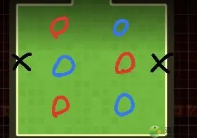(注释:黑色圆圈是炎爆怪/激光怪;红色三角是攻击减免塔;蓝色三角是防御减免塔;橙色三角是激光塔;白色圆圈是重伤塔)